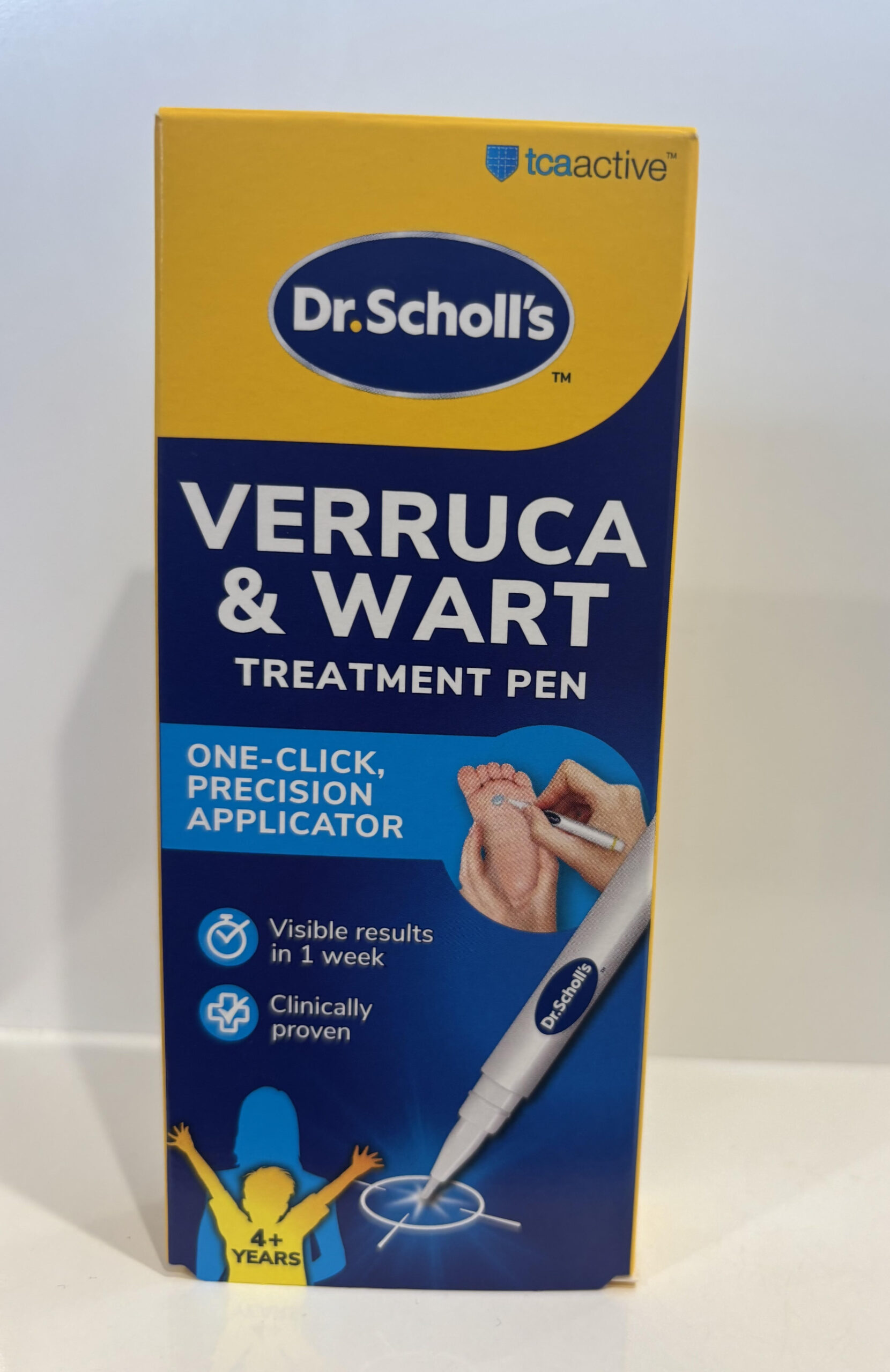 The Dr.Scholl’s Verruca and wart treatment pen is clinically proven to treat warts & verruca’s on hands and feet. The treatment pen contains a gel, based on the ingredient TCA- Active, which induces peeling of the infected skin. The thickened skin and its causative virus are removed and new healthy skin will appear. With the precision tip, the gel is easily applied on the wart or verruca. A blue colouring agent is added to the gel to further facilitate precise application and to prevent accidental application to healthy skin.