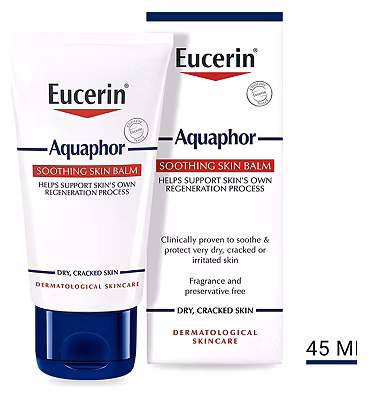 Suitable for dry, cracked skin, Eucerin’s Aquaphor Soothing Balm nourishes and protects the skin to help soothe feelings of sensitivity.
